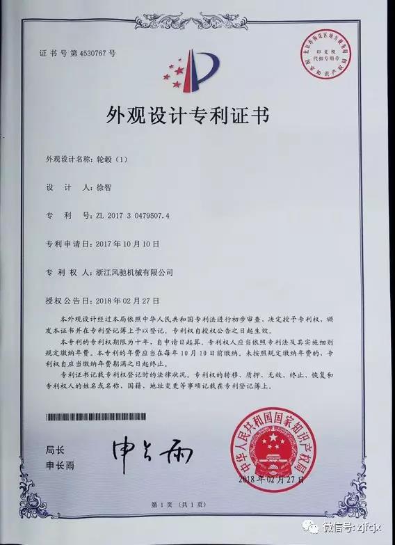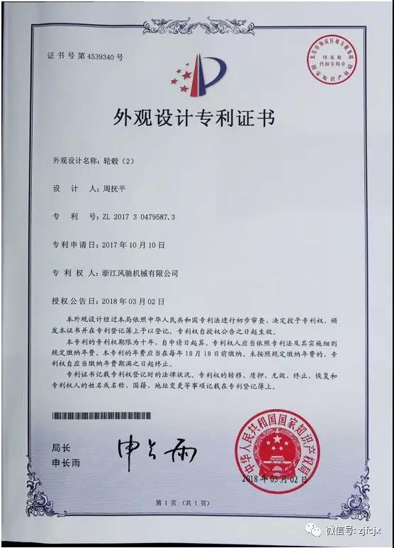2018年2月榮獲“輪轂”外觀設(shè)計(jì)專利證書